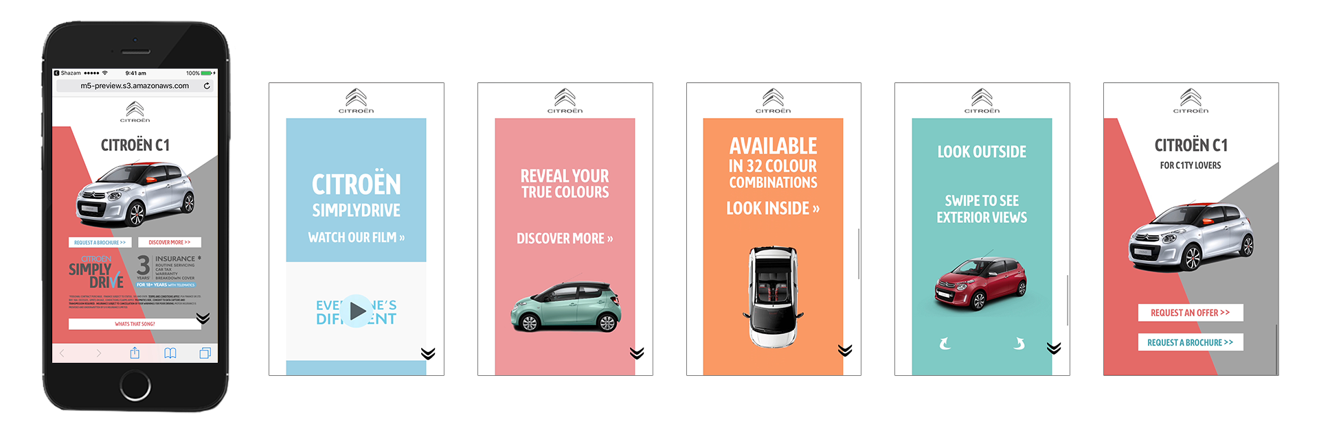 Citroën partnered with Shazam to create an interactive mobile takeover campaign, and I was tasked with designing the ad experience. The idea was simple: when viewers heard the Citroën TV ad, Shazaming the track would take them directly to this mobile takeover showcasing the C1. The challenge was making the experience stand out in and designing it in a way that would make customers want to buy the car. I used bold, bright colours to create an eye-catching, fresh feel that aligned with how the C1 was being advertised at the time. This project was a valuable exercise in translating a TV-led campaign into a cohesive digital experience that felt playful, engaging, and on-brand. Below you can see a video of the ad along with a breakdown of each page.